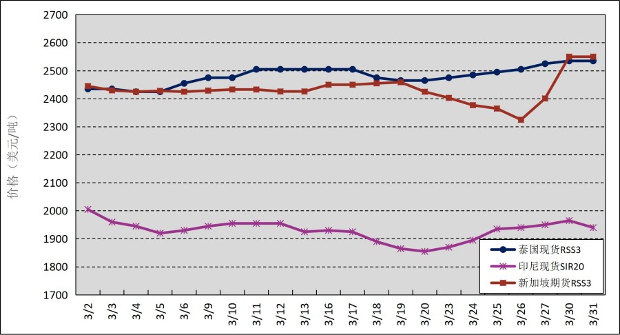 國外主產(chǎn)區(qū):3月,國外主產(chǎn)區(qū)價(jià)格呈小幅波動(dòng)態(tài)勢。其中,泰國3號煙片膠(RSS3)平均價(jià)格2482美元/噸,環(huán)比增加229美元/噸,最高價(jià)2535美元/噸,最低價(jià)2425美元/噸;印尼20號標(biāo)準(zhǔn)膠(SIR20)平均價(jià)格1930美元/噸,環(huán)比增加28美元/噸,最高價(jià)2005美元/噸,最低價(jià)1855美元/噸。