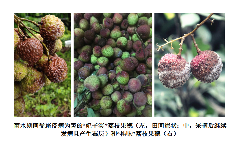 荔枝霜疫病是我國除海南外其它主產(chǎn)區(qū)的主要病害,在荔枝果實(shí)轉(zhuǎn)色至成熟階段,如遇雨天最易發(fā)生流行,可造成大量的荔枝果實(shí)褐變、腐爛(見下圖)。過去10天,華南地區(qū)降水量較常年同期顯著偏多,大部地區(qū)累計(jì)降水60—90毫米,部分地區(qū)120—220毫米,局地超過260毫米。各監(jiān)測站調(diào)查發(fā)現(xiàn),受此天氣影響,果園濕度大,荔枝霜疫病在中晚熟產(chǎn)區(qū)已有不同程度的積累和發(fā)生,少數(shù)果園病果率在10%以上。據(jù)中國天氣網(wǎng)最新預(yù)報(bào):未來10天,我國江南、華南、西南地區(qū)東部及江漢等地整體降雨量較常年同期偏多2—7成,部分地區(qū)偏多1—2倍或以上,降雨量將達(dá)到50—150毫米,部分地區(qū)達(dá)到180—250毫米,局地超過400毫米。這種雨水天氣勢必會(huì)加重荔枝果實(shí)霜疫病的發(fā)生與流行。對此,荔枝病蟲害監(jiān)測與防控項(xiàng)目專家組建議荔枝主產(chǎn)區(qū)監(jiān)測站和生產(chǎn)管理部門應(yīng)密切關(guān)注本地區(qū)天氣變化,加強(qiáng)監(jiān)測并及時(shí)指導(dǎo)荔枝種植者做好病害防控工作。